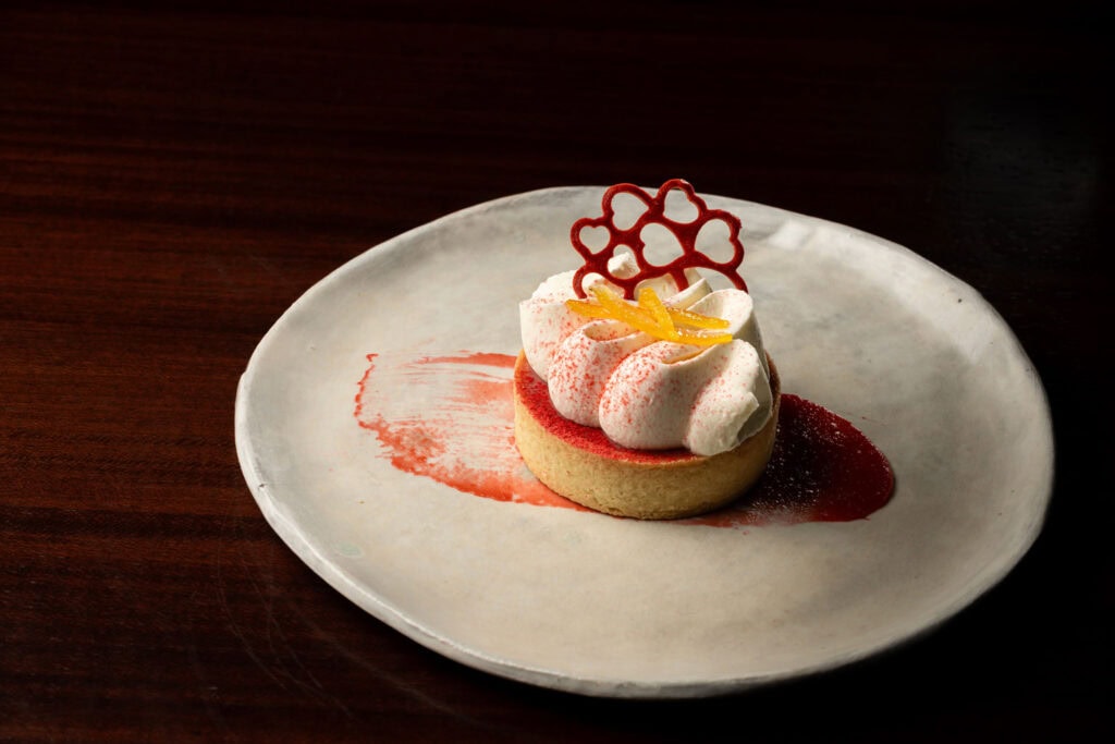 タルトベース、マッチャビスキット、イチゴ、クレームパティシエール、マスカルポーネクリーム、イチゴのチュイル、イチゴソース、柚子の皮のピクルス