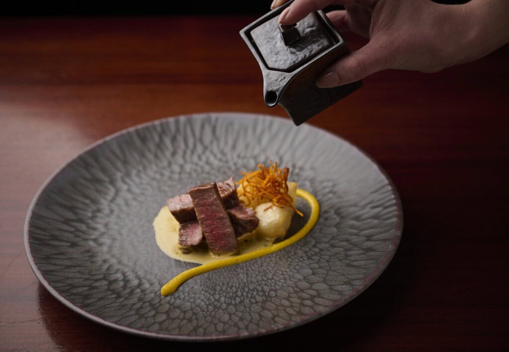 バター熟成和牛、塩漬け卵黄のエスプーマ、赤ワイン醤油のジュ、味噌漬けのカブ(ビーツ)