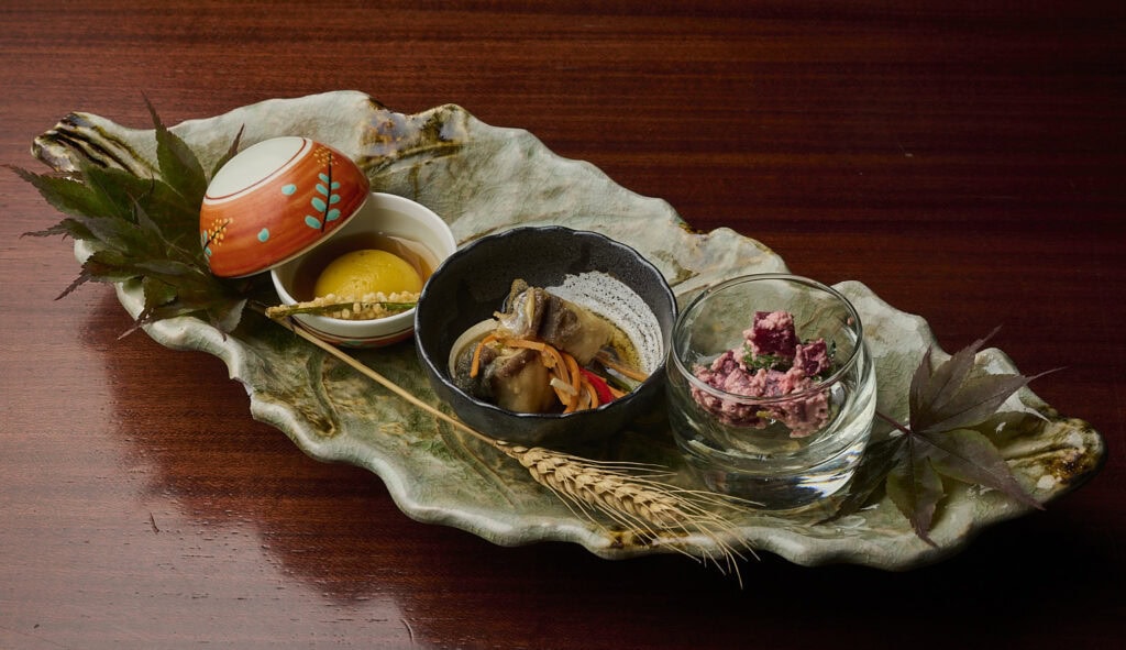 Dreierlei Vorspeise: Saba Nanbanzuke (leicht süß-sauer marinierte Makrele), Kabocha-Tofu mit Ahorn–Soja und Bubu Arare, sowie Shira-ae von Roter Bete & Süßkartoffel.