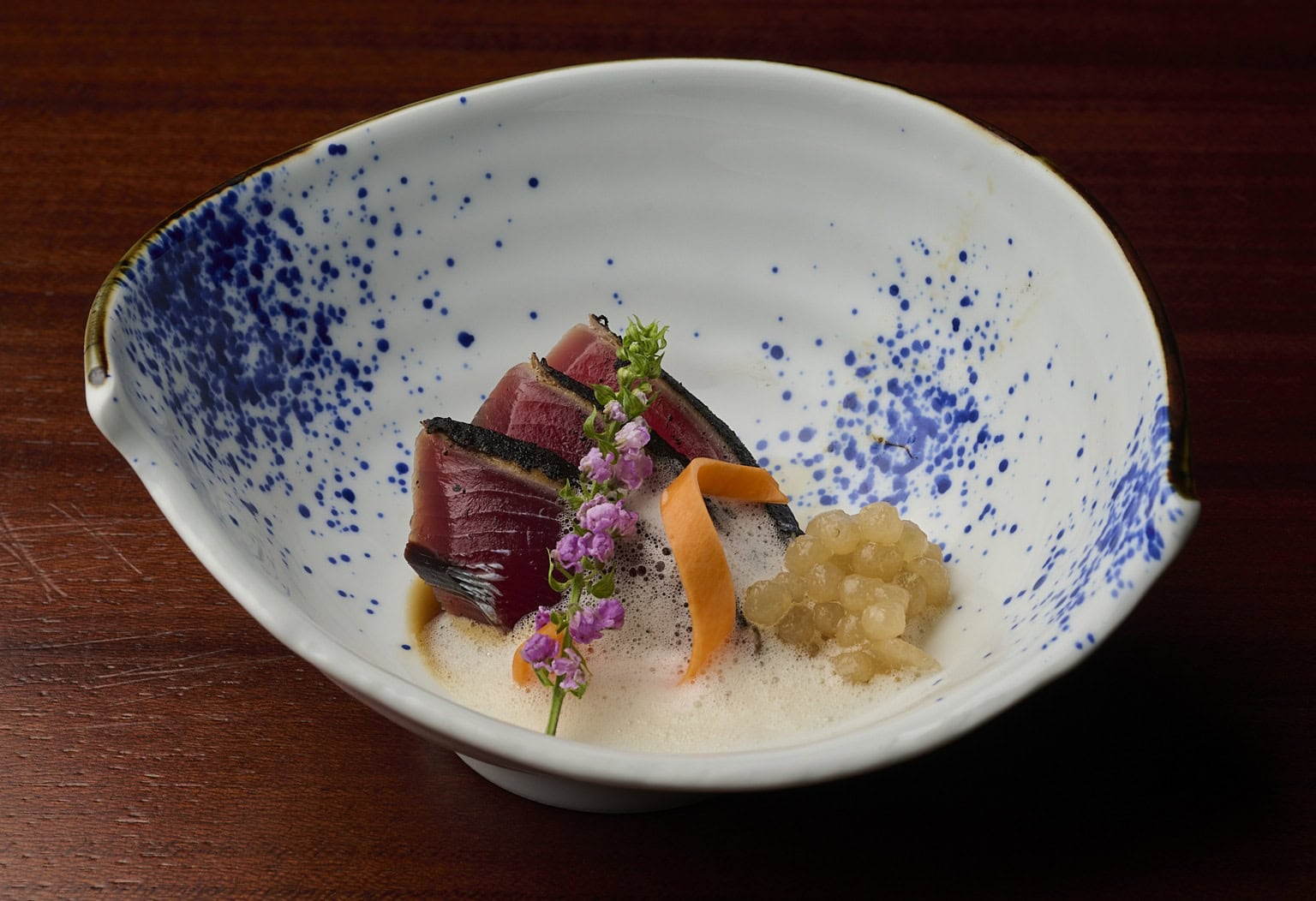 Bonito Tataki – kurz im Heu geräuchert, zart angeflammte Scheiben mit Zwiebel-Ponzu und Nashi; duftige Myōga- und Shiso-Akzente.