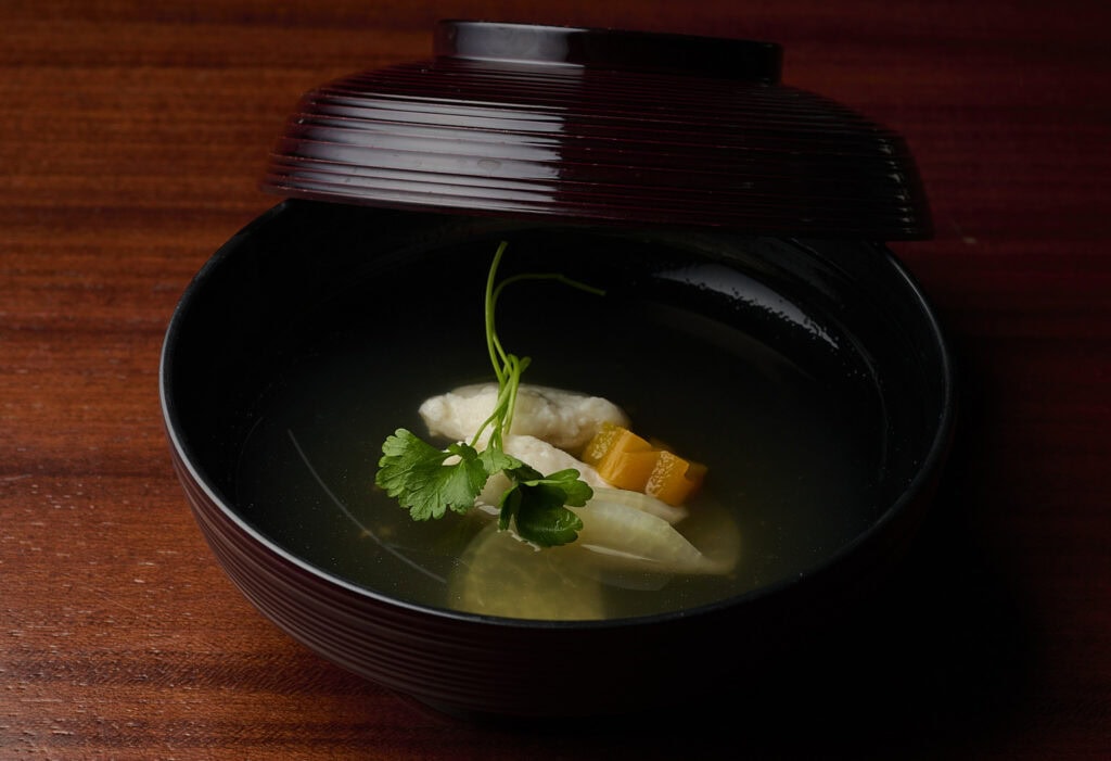 Klarer Pilzfond auf Kombu–Katsuobushi, Hirame-Shinjō mit Nagaimo; Kohlrabi, Mitsuba, Yuzu-Zeste. Ein leiser Gang, der Dashi und Pilzaroma sprechen lässt.