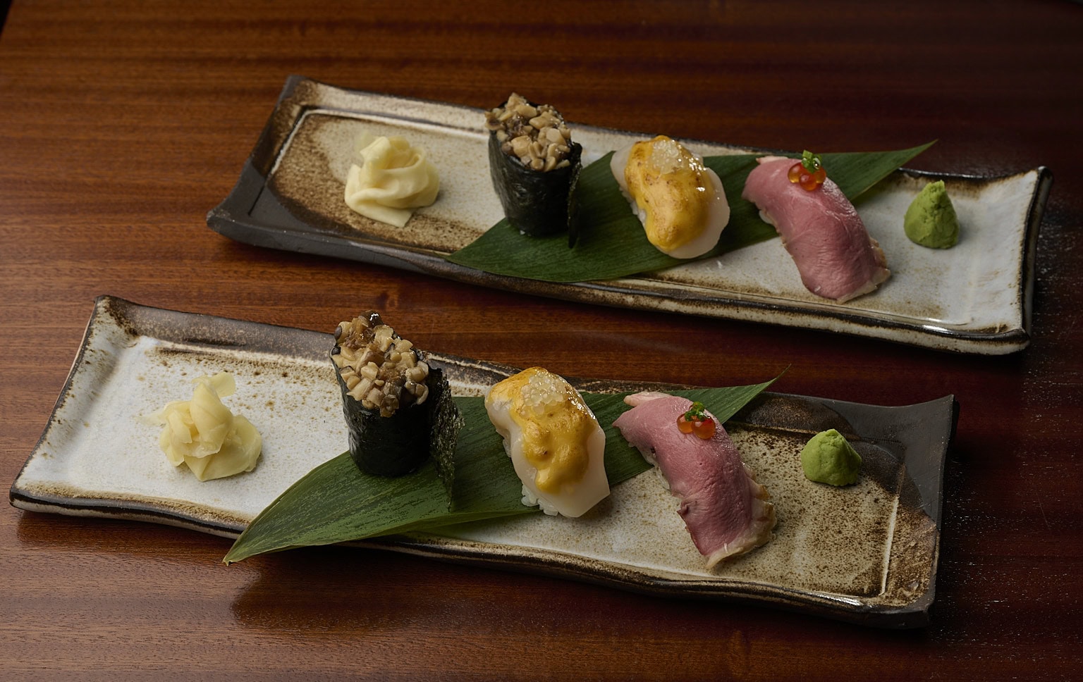 Hotate Nigiri mit Uni-Butter, Gunkan Kinoko mit Shimeji & Shiitake, Kamo Niku Nigiri – hauchdünne Entenbrust, honigglasiert.